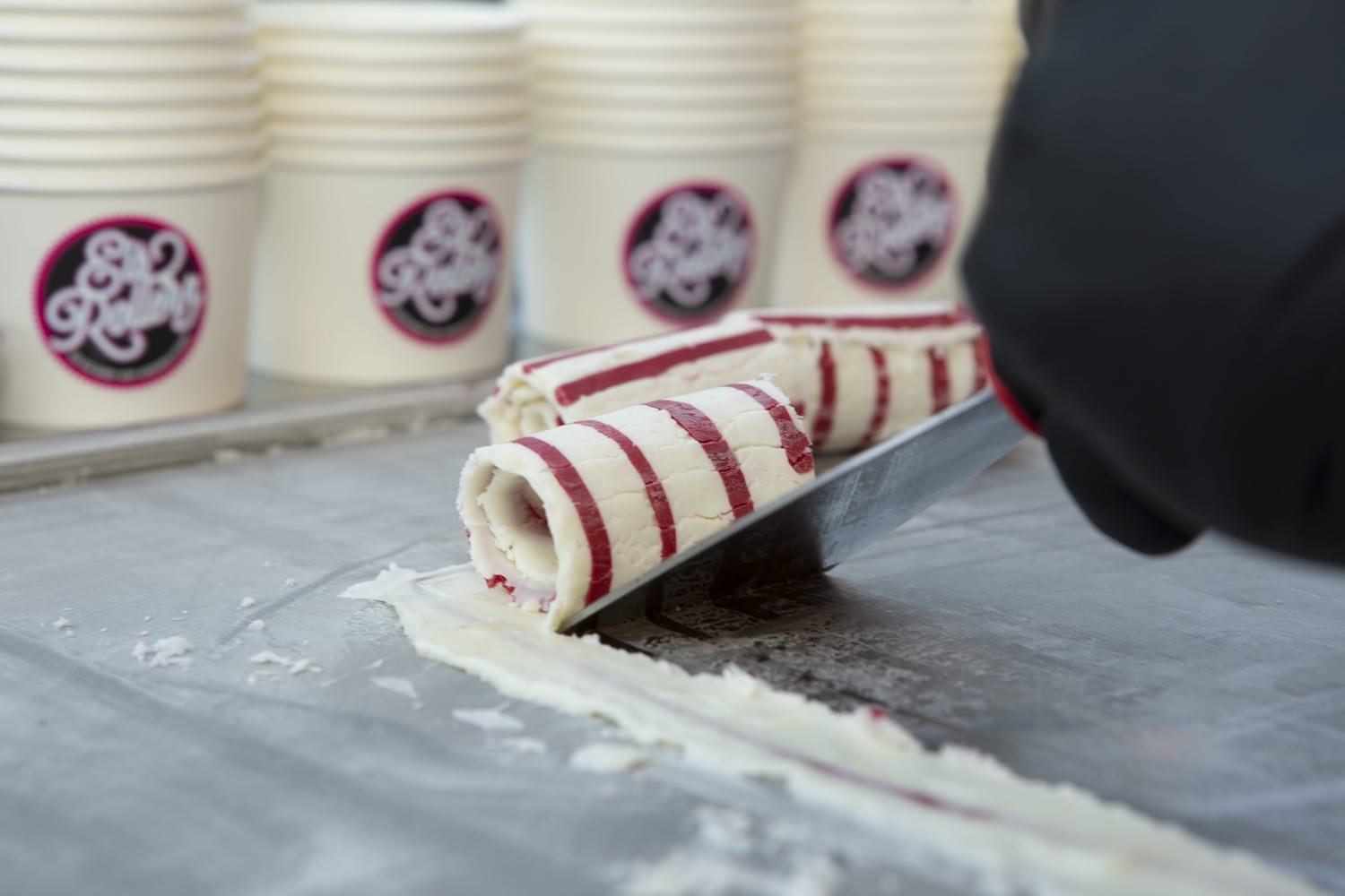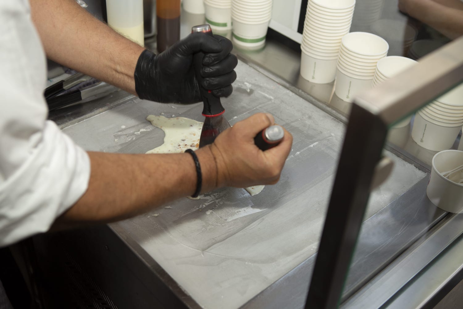 Die so entstandene Masse wird mit Spachteln dünn auf der kalten Platte ausgebreitet und mit einer ausgefeilten Dreh- und Wendetechnik zu portionsgerechten Eisrollen geformt.